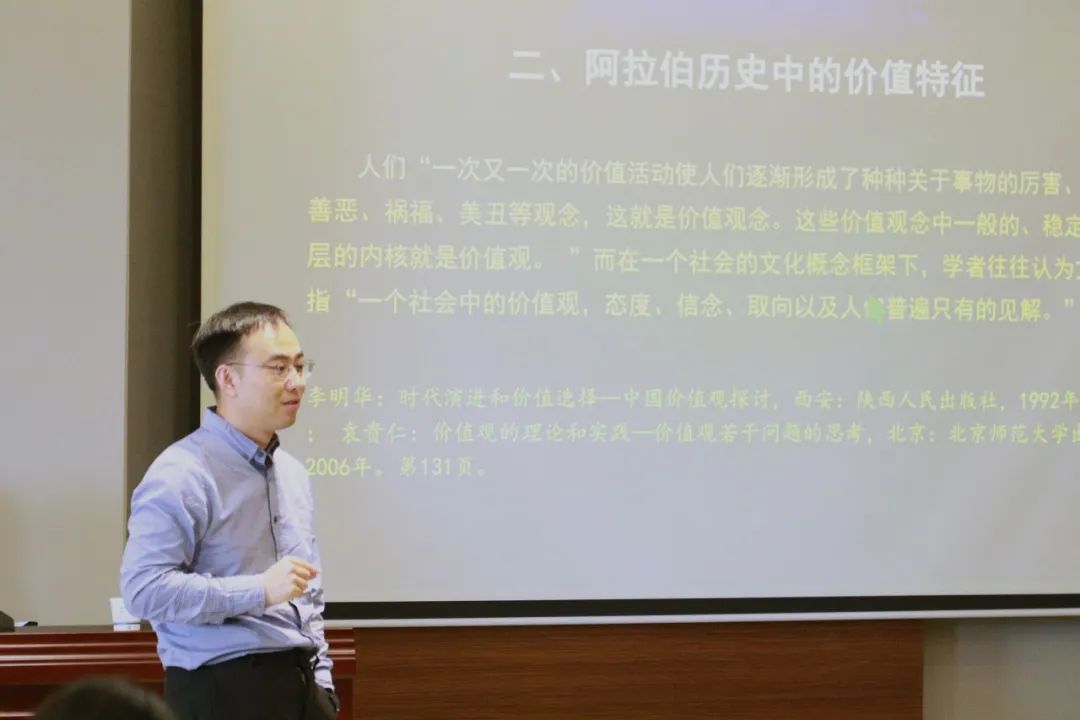 随后,侯教授从“宗教本位”的社会思想和“教俗一体”的社会实践两方面讲述了“伊斯兰”特征,并将外来文化特征与阿拉伯文化特征进行了比较,他提出“苦难”一词是中国人与阿拉伯人的共鸣点。最后,侯教授总结到,阿拉伯民族特征、“伊斯兰”特征与外来特征三者之间相互构成“矛盾”,这三者之间的冲突与融合、激荡与平静,共同形成了阿拉伯一伊斯兰历史的曲折路径和多元趋势,为当今阿拉伯一伊斯兰世界的多面画像提供了丰富素材,也让中东地区的“世界”“宗教”“现代化”等核心概念及其认识状况愈发多样。