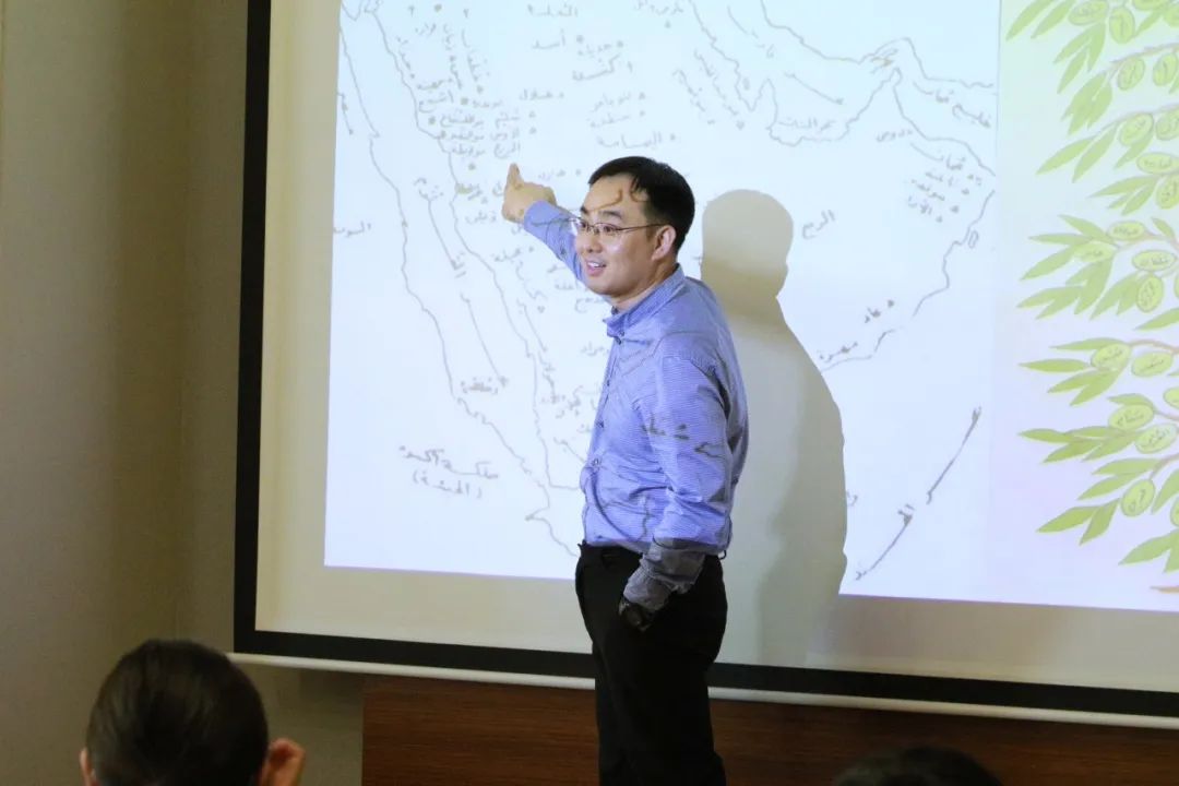 侯教授首先展示了阿拉伯历史大事年表,讲述了阿拉伯社会各分期的历史特点,区分了狭义、广义的阿拉伯社会和伊斯兰社会,他特别强调了形成场景与时空观念的重要性,要求同学们对宏达的历史系统形成基本认识,提出要从时间和空间两个方面看待和学习阿拉伯文化。