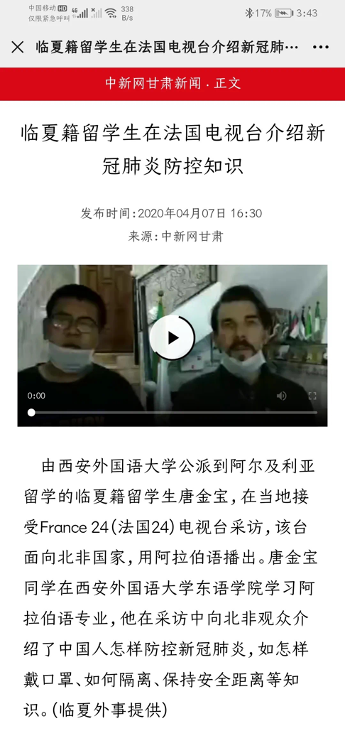 唐金宝学长曾获得学校推荐,参与2019年欧亚经济论坛志愿服务,负责接待部分外宾及中国驻俄罗斯前大使李辉,曾参加了第四届丝绸之路(敦煌)国际文化博览会暨第九届敦煌行丝绸之路国际旅游节甘肃临夏站志愿服务活动,负责接待部分阿拉伯外宾,曾于大三时获得教育部公派留学名额并前往阿尔及利亚人民民主共和国公派留学九个月,在阿尔及利亚留学期间,受到学校推荐,接受电视台France24(法国24)关于中国防疫措施的采访,并于后来接受中国新闻网甘肃网以及甘肃省民族日报的采访,并于在阿期间,在中国铁建驻阿尔及利亚特莱姆森项目部实习三个月,负责日常的口译笔译工作。