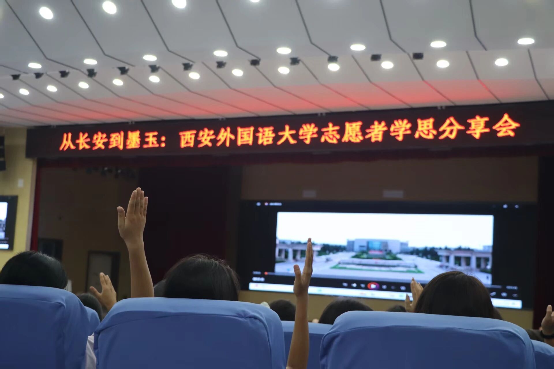 分享会现场气氛热烈,互动频频。实践团成员倾情展现了十三朝古都西安的深厚底蕴与西安外国语大学“爱国、勤奋、博学、创新”的昂扬风采,将千年丝路文脉与时代精神生动传递。