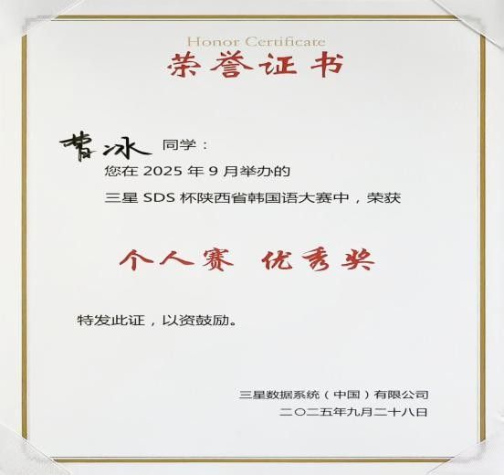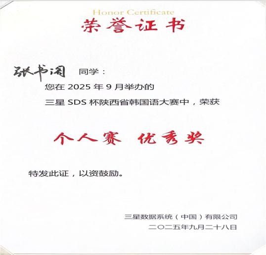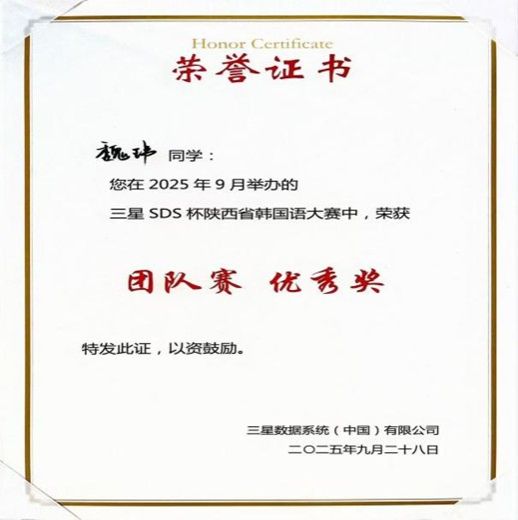 在2025年9月28日落幕的“韩韵秦风·语你同行”“三星SDS杯”陕西省大学生韩国语大赛中,我校韩国语专业6名学生凭借扎实的语言功底和出色的现场发挥,从全省5所高校的数十名选手中脱颖而出,斩获多项荣誉。同时,1名教师凭借卓越的指导能力荣获“最佳导师奖”。