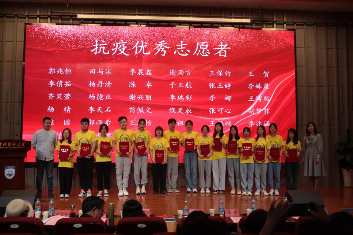 副院长唐雪梅宣读表彰文件,希望全院学生以受表彰的先进个人为榜样,不忘初心、牢记使命,努力在奉献祖国的实践中成长。与会领导分别为抗疫杰出志愿者和抗疫优秀志愿者颁奖。