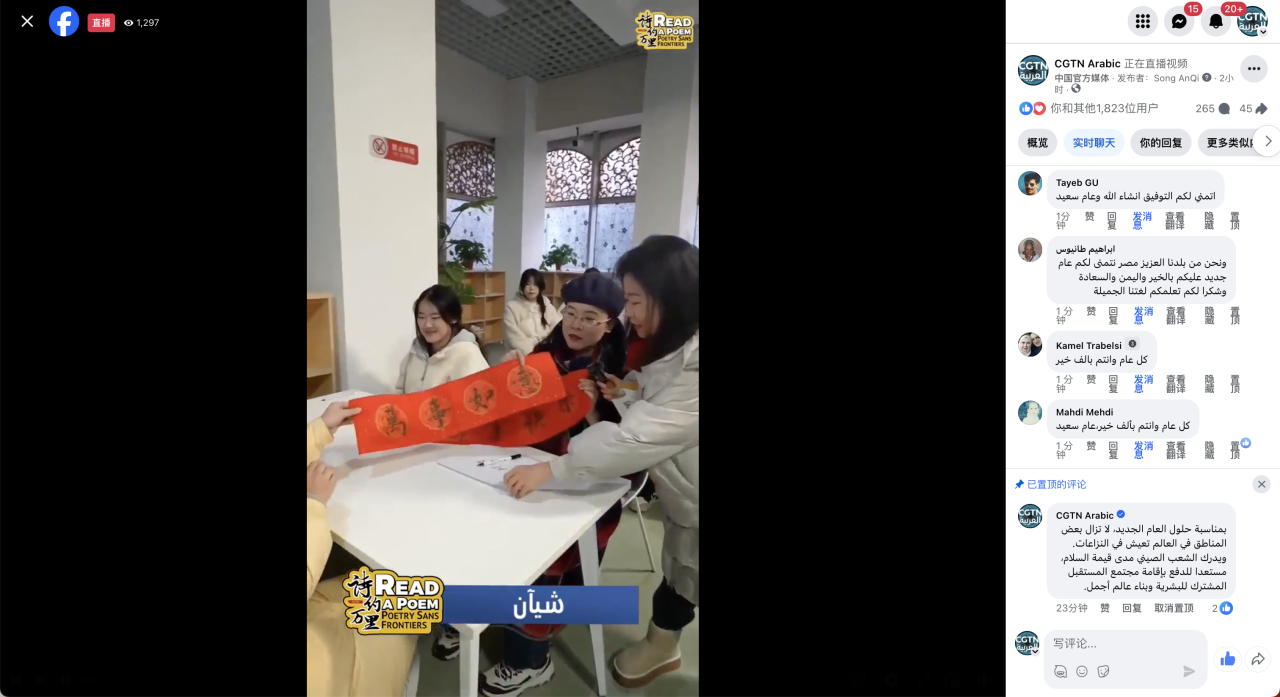 30余名阿拉伯语专业师生代表参加录制《将读诗进行到底——我在全世界为你读诗》跨年特别节目。在2024年新年到来之际,中央广播电视总台在悉尼、西安、长沙、阿拉木图、开罗、巴黎和墨西哥城分别搭建直播点位。该节目通过CGTN阿拉伯语部直播平台播发与阿拉伯网友共同迎接新年。
