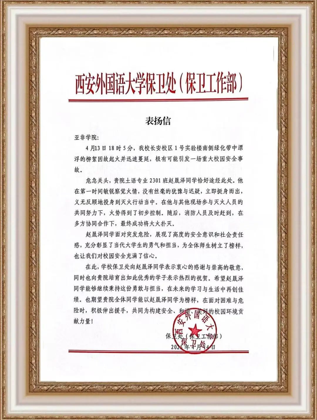 土耳其语专业2301班赵晟泽同学恰好途经此处。他在第一时间敏锐察觉火情,毫不犹豫地投身到灭火行动当中。在他与其他现场参与灭火人员的共同努力下,火势得到了初步控制。随后,消防人员及时赶到,在多方协同合作下,最终成功将大火扑灭。