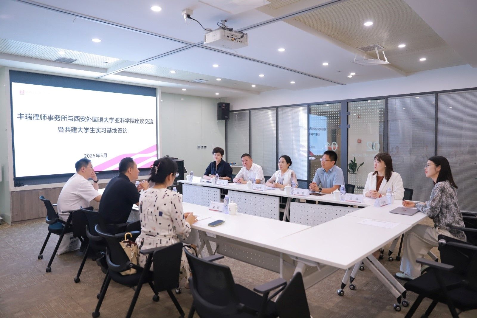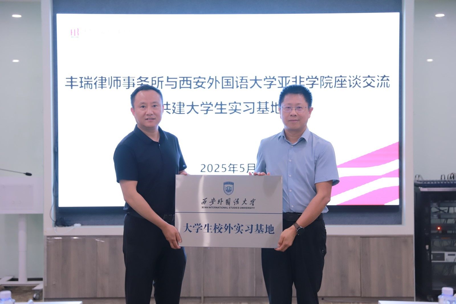 一行在律所人员的引导下参观了丰瑞律所,了解律所业务特色。在座谈交流环节,双方围绕多个主题展开讨论,明确未来合作方向,达成多项共识: 一是加强课程共建,联合开发法律与外语交叉相关课程;二是加强交流互访,促进各项工作落地,三是搭建平台,共同开展涉外法律服务业务;四是为学生提供涉外法律等方面实习机会。 随后双方签订《共建大学生实习基地协议》,并共同为实习基地揭牌。