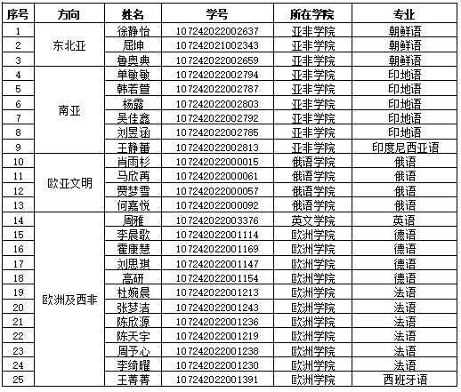 根据《西安外国语大学 区域国别IYX 国别和区域研究本科人才实验班(第三期)招生简章》要求,经个人申请、IYX 审核、综合遴选,徐静怡等25名同学入选国别和区域研究人才实验班(第三期),具体名单如下: