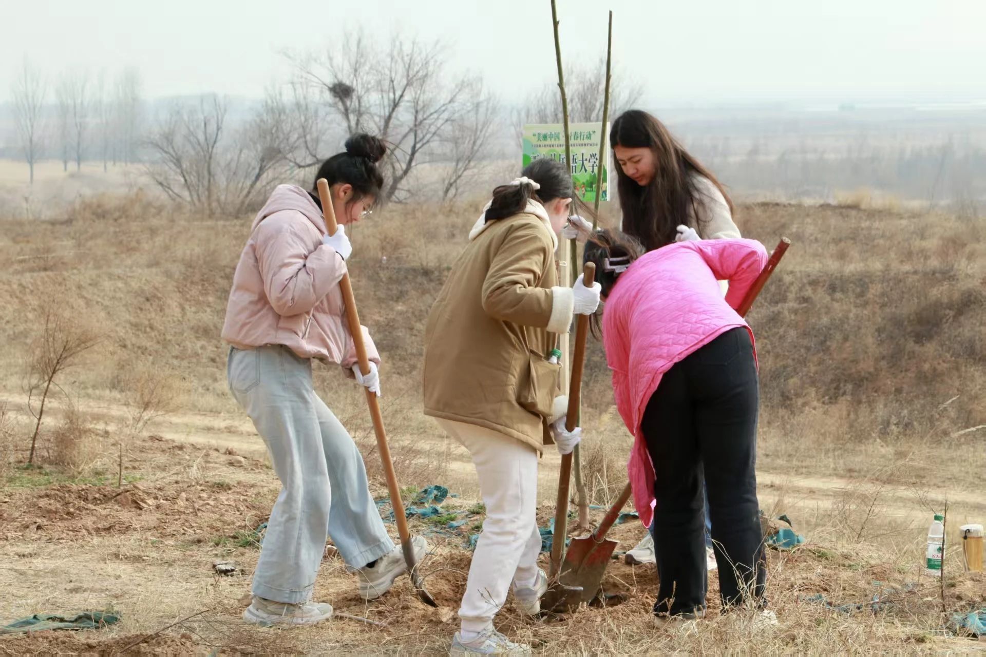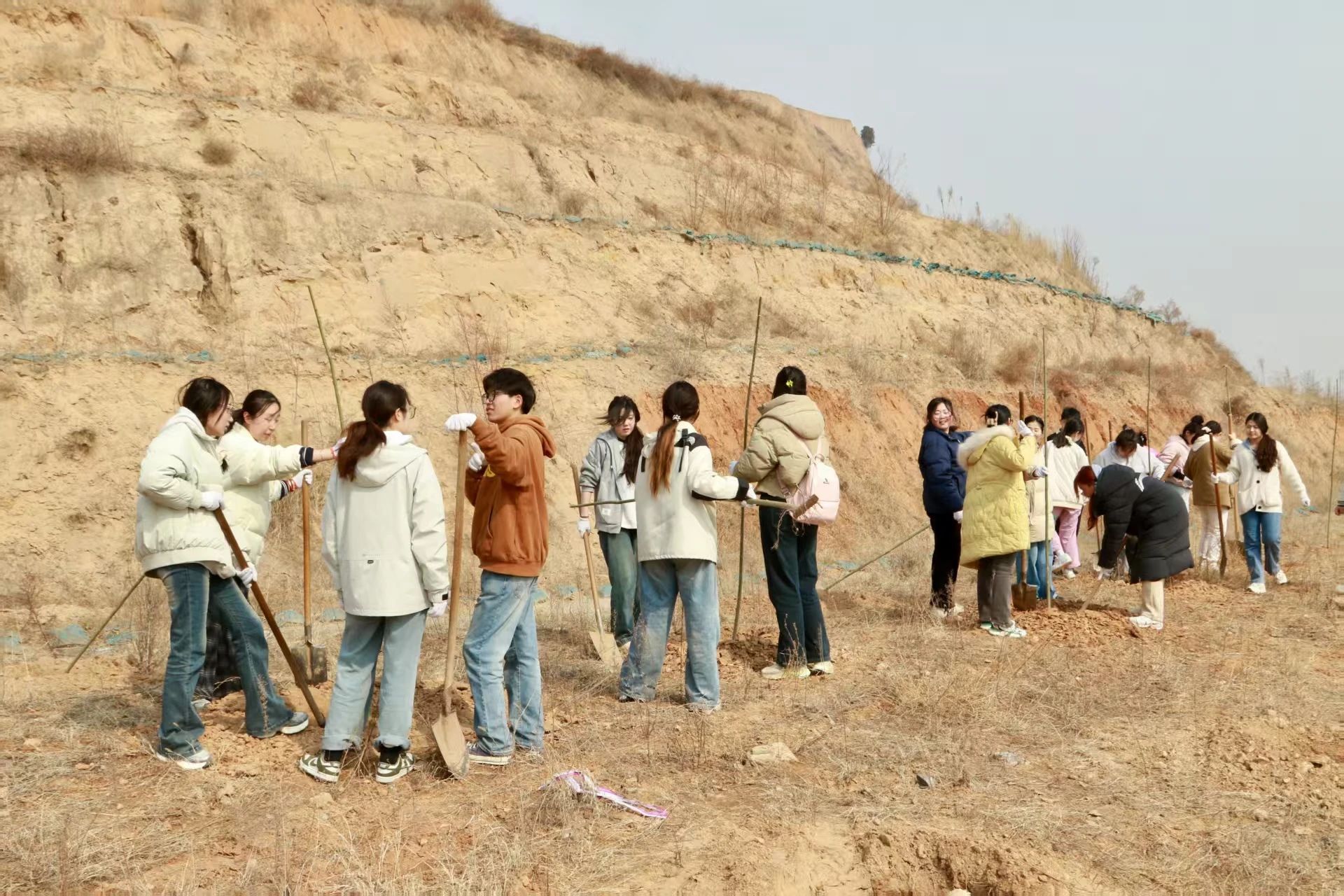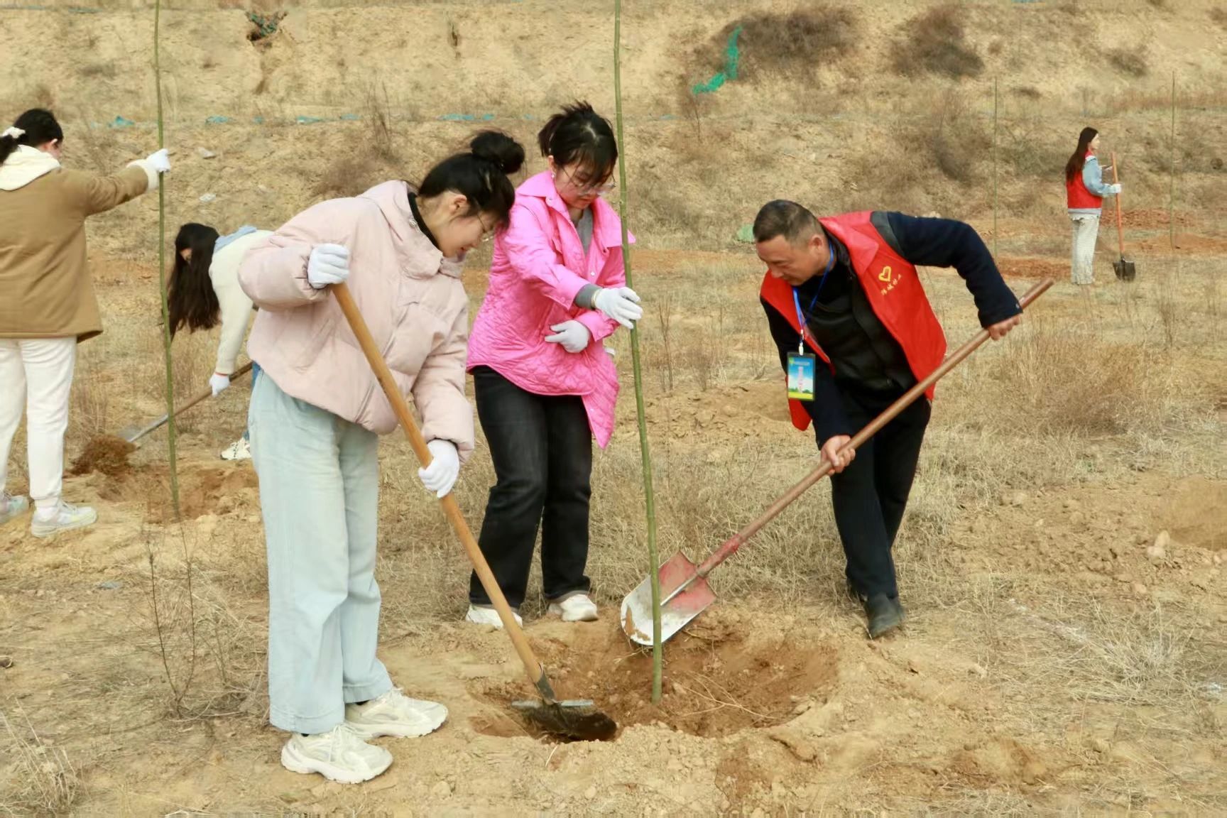 活动伊始,韩城林业的两位工作人员为大家现场分享科学植树的经验,树苗摆放成行成列共挡风沙、守卫青绿。细致入微的讲解不仅激发了在场师生的兴趣,也为大家夯实了植树的理论基础。