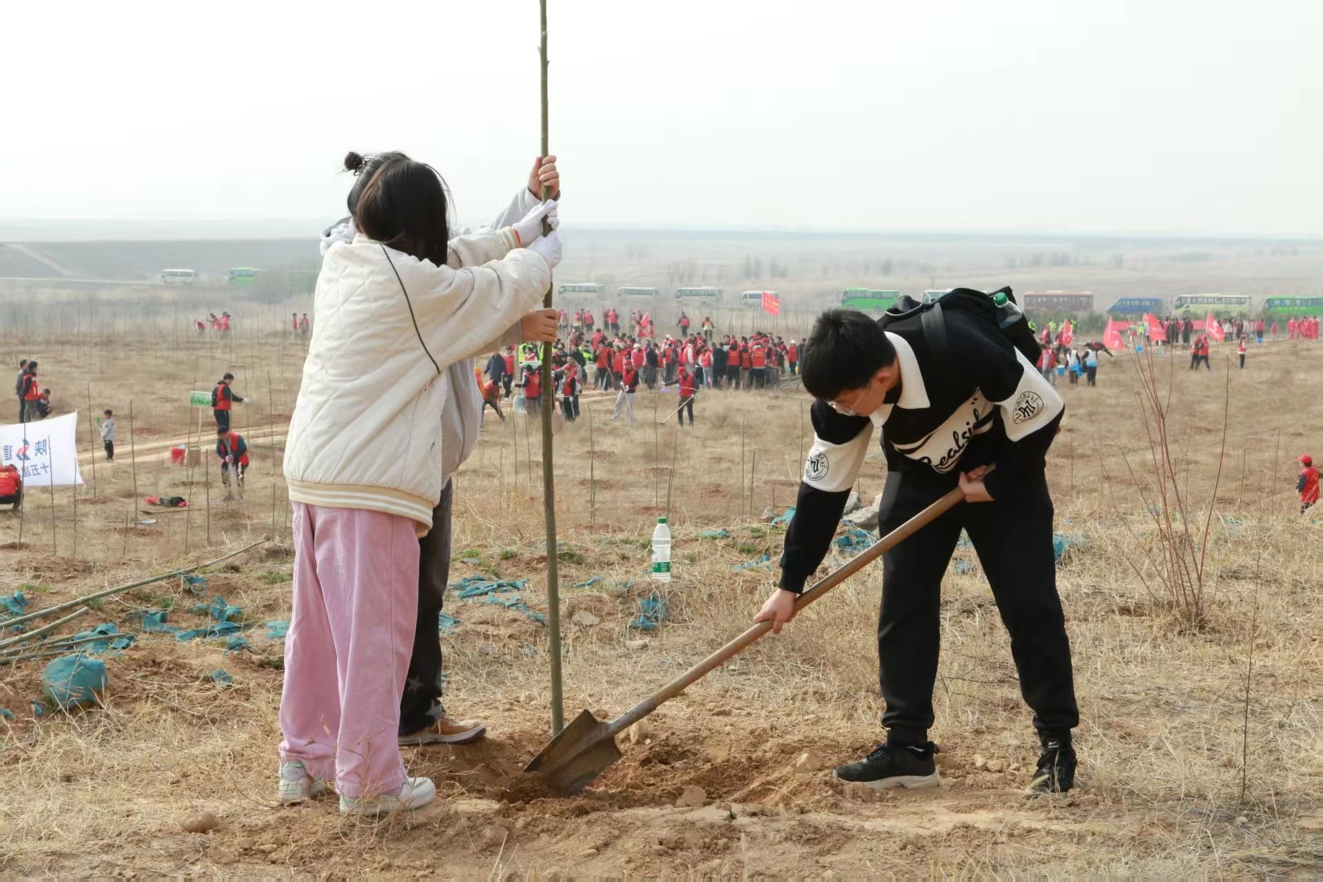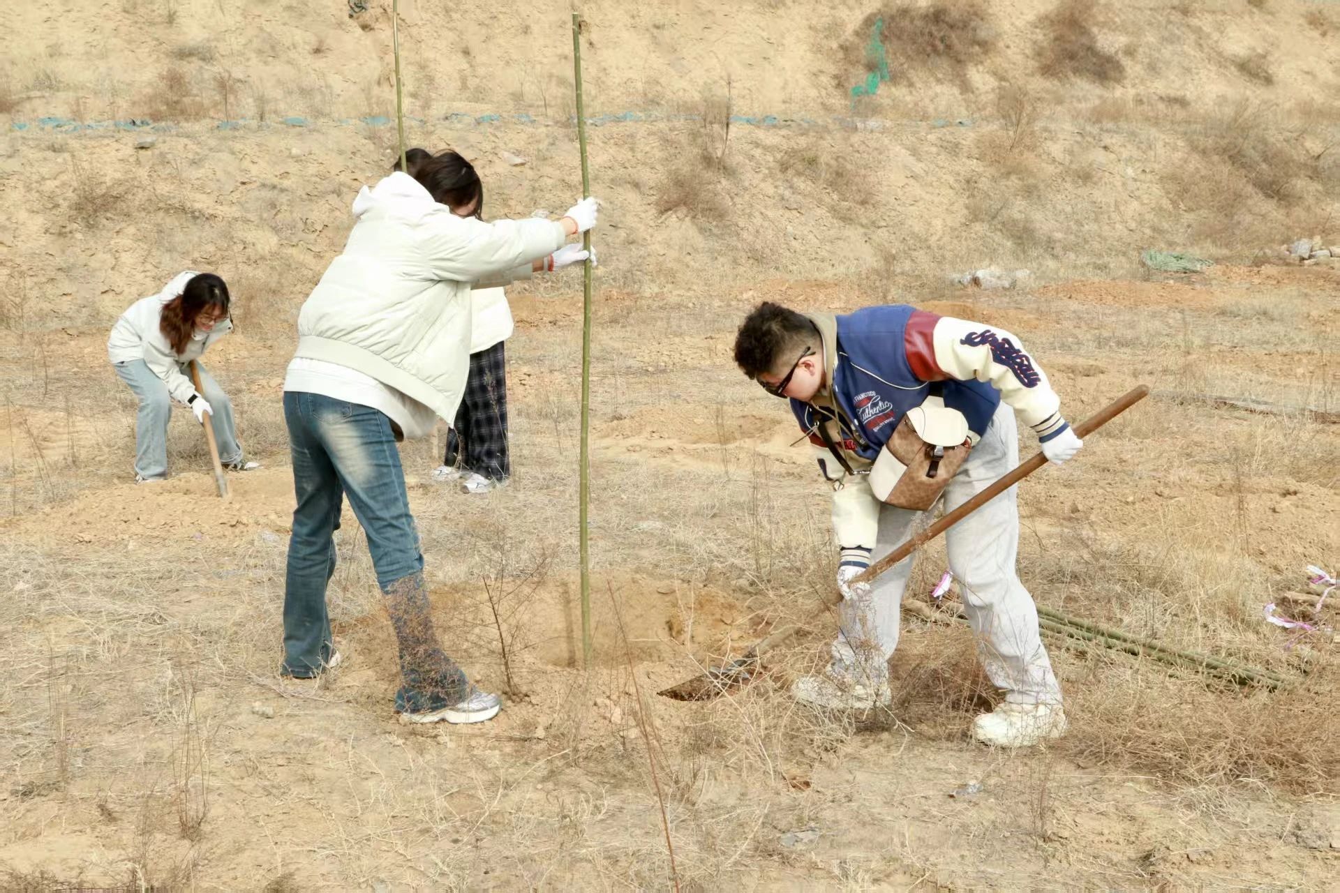 活动过程中,党员同学们冲锋在前,用实际行动诠释先锋模范作用,团员同学们挽袖挥锹紧随其后,上下同心,挖坑如布阵,放苗似安家。栽植有巧劲,树盘修漏斗。最后一桶清水缓缓浇下,大家一齐为小树苗们掖好了被角。师生们额头沁汗却都笑意盈盈,他们深知种下的不只是一颗颗树苗,更是一种切身实践、齐心协力的精神。传承红色基因,推进绿色发展,待枝繁叶茂时,每一圈年轮都会记得这个春天的耕耘与温度。