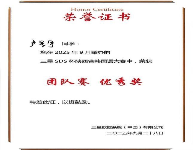 在2025年9月28日落幕的“韩韵秦风·语你同行”“三星SDS杯”陕西省大学生韩国语大赛中,我校韩国语专业6名学生凭借扎实的语言功底和出色的现场发挥,从全省5所高校的数十名选手中脱颖而出,斩获多项荣誉。同时,1名教师凭借卓越的指导能力荣获“最佳导师奖”。
