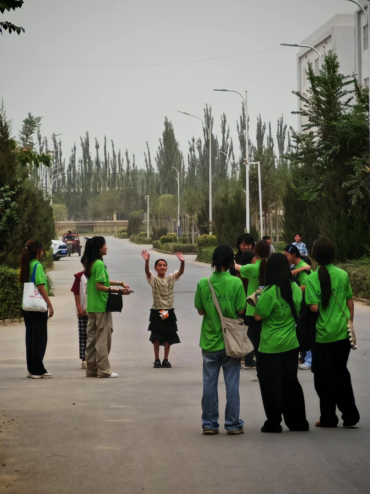 今日之行,是实践团“语润乡村”使命的温情注脚,更是铸牢中华民族共同体意识的生动实践。 从笔墨纸砚间的文化浸润,到丝路历史的深情回望;从巧手折纸的梦想放飞,到踏歌共舞的民族团结;从歪歪扭扭的汉字祝福,到飞奔而来的不舍身影——我们深切感受到,在这片辽阔的边疆热土上,孩子们如大漠中的春蕾,渴望着知识的浇灌与爱的滋养。