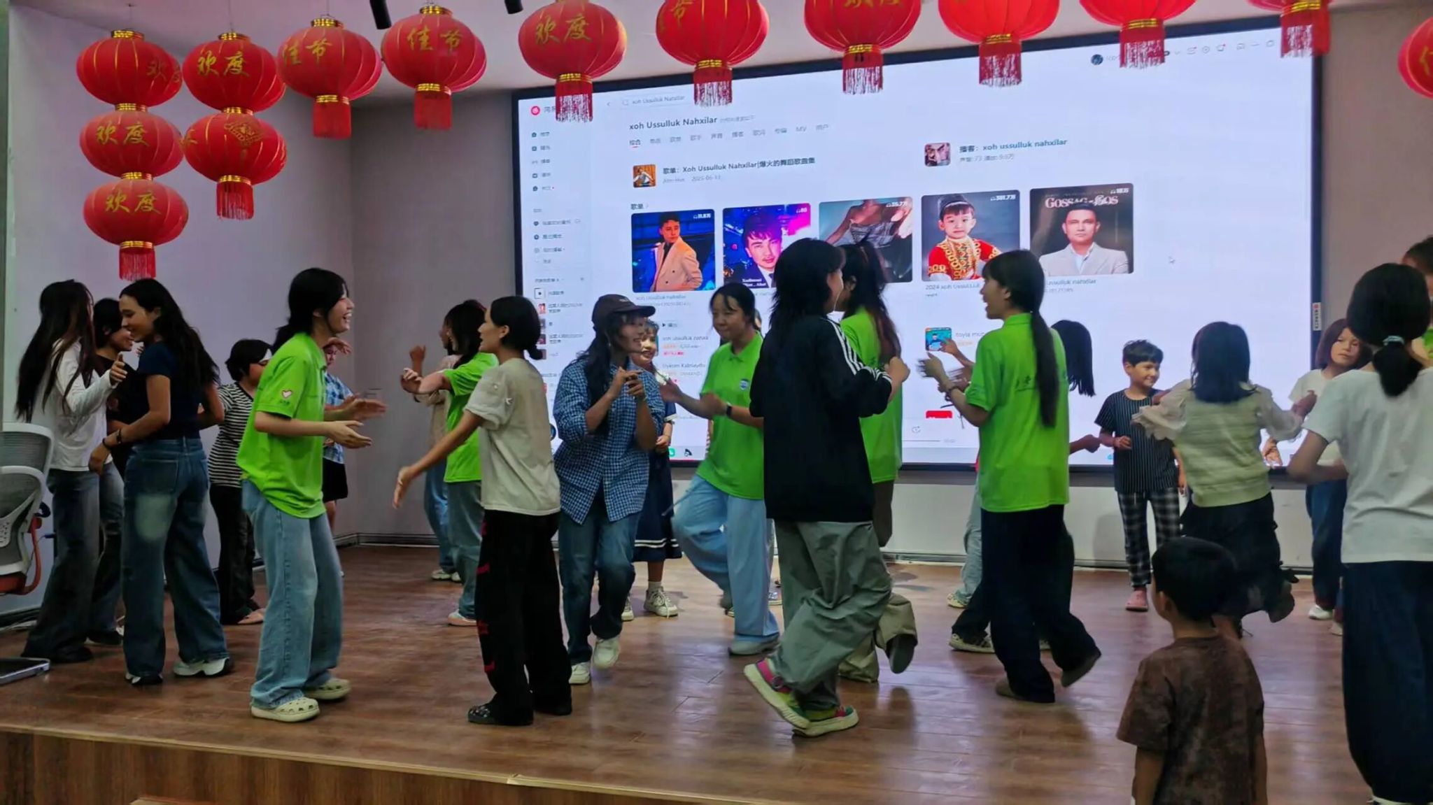 课间休息之时,队员们为台下孩童们播放了具有地域特色的新疆歌曲。随着音乐节奏感逐渐加强,现场气氛随之活跃起来。队员和孩子们一同,站在台上或是台下,伴随着音乐,翩翩起舞。孩子们热情牵起老师的手,踩着鼓点,传授灵动舞步。随着歌曲一首又一首,大家一同站在台上,围成一个大圆圈,一同转圈起舞。大家一起随着音乐起舞,个个脸上都洋溢着开心幸福的微笑,好像忘记了,大家是今天早上才认识的。在旋转的圆圈舞中,心与心紧密相连,民族团结的暖流在旋律中激荡。