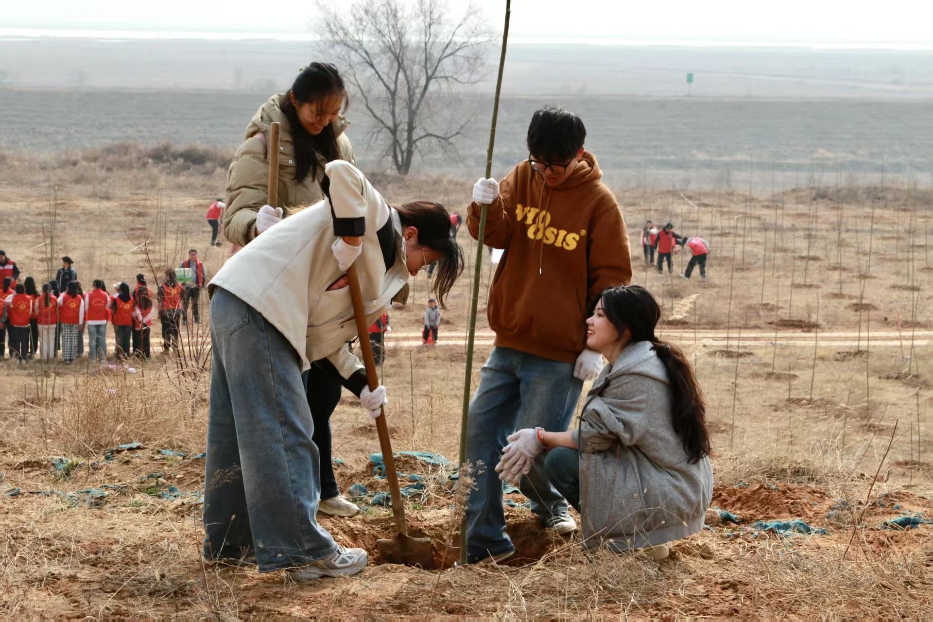 活动过程中,党员同学们冲锋在前,用实际行动诠释先锋模范作用,团员同学们挽袖挥锹紧随其后,上下同心,挖坑如布阵,放苗似安家。栽植有巧劲,树盘修漏斗。最后一桶清水缓缓浇下,大家一齐为小树苗们掖好了被角。师生们额头沁汗却都笑意盈盈,他们深知种下的不只是一颗颗树苗,更是一种切身实践、齐心协力的精神。传承红色基因,推进绿色发展,待枝繁叶茂时,每一圈年轮都会记得这个春天的耕耘与温度。