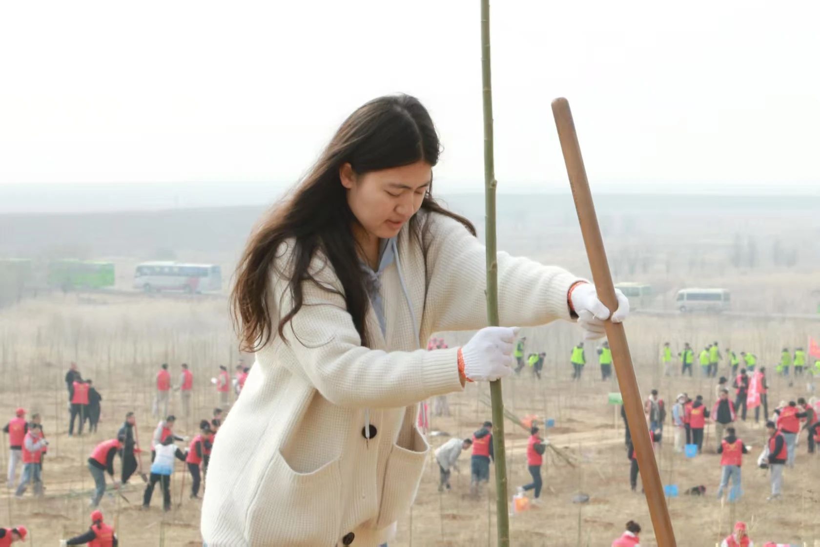 活动伊始,韩城林业的两位工作人员为大家现场分享科学植树的经验,树苗摆放成行成列共挡风沙、守卫青绿。细致入微的讲解不仅激发了在场师生的兴趣,也为大家夯实了植树的理论基础。